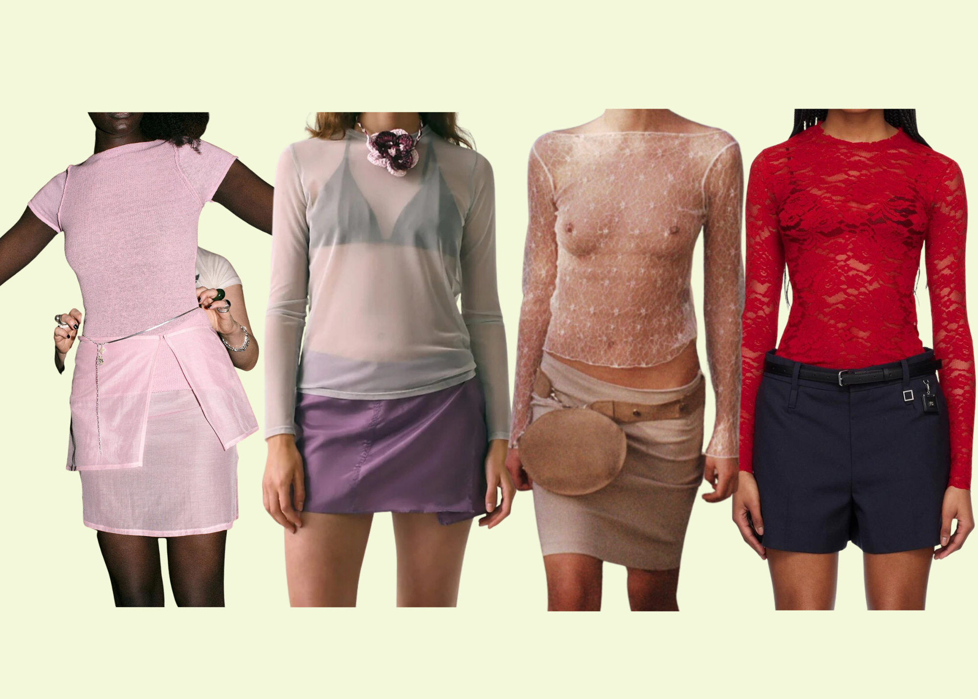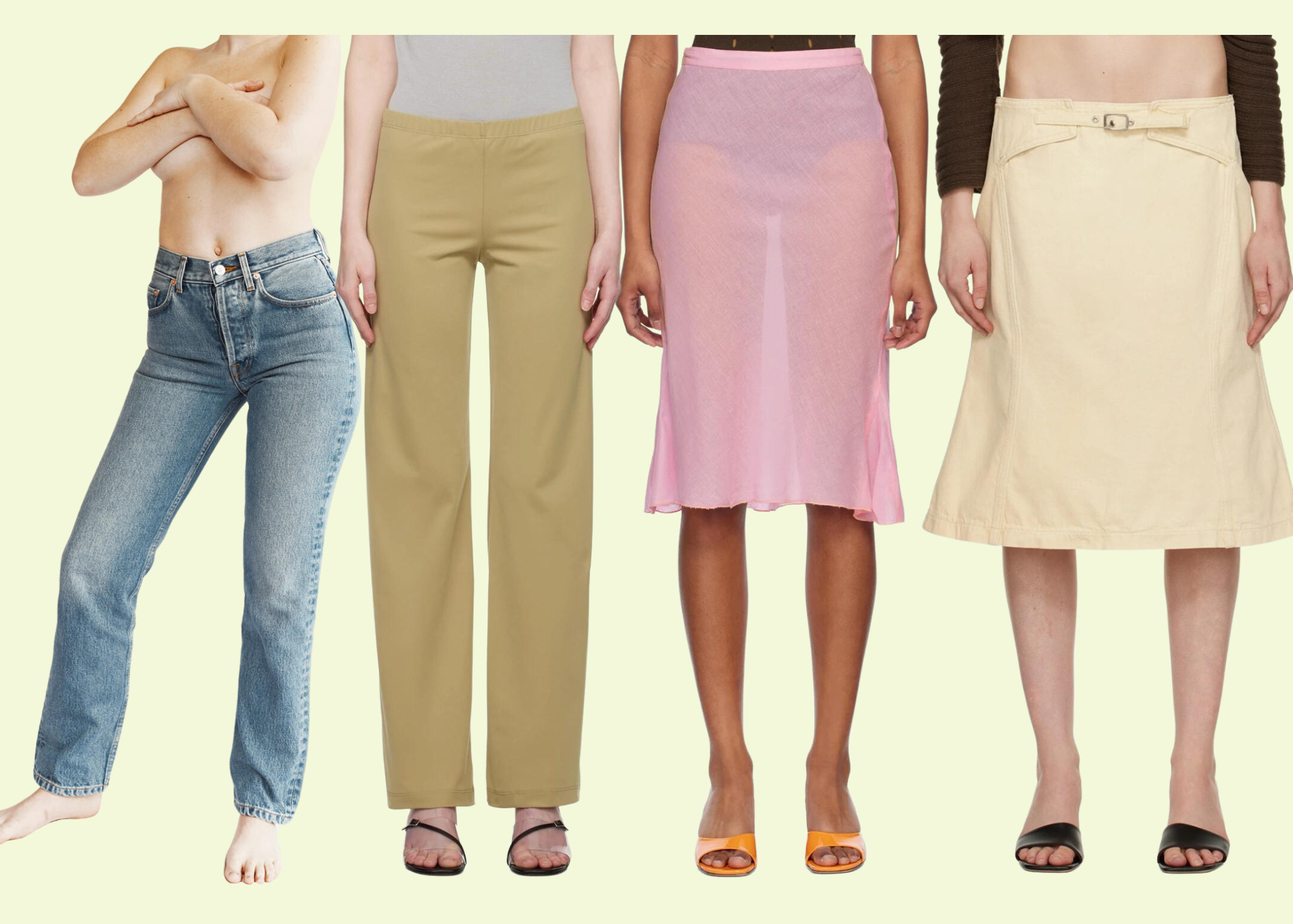 Classic, straight-leg FEEL studios denim would balance out any of the sheer tops listed above quite nicely—if you’re a subscriber, check the Substack chat for a discount code. I’d opt for the Maryam Nassir Zadeh dance pants with the Gabriel for Sach sheer top and strappy black heels. I’ve worn my own MNZ dance pants with the KYE Intimates Overlay Slip Dress and a CUUP balconette bra and loved the effect, as well. Double up on the varying levels of sheer and couple the Gimaguas pink skirt with the Gabriel for Sach top + CUUP balconette. I’d also happily wear the sheer pink skirt with a white Nu Swim organic cotton tank and vintage mules. Finally, try the Gimaguas yellow skirt with the sheer pink Paloma Wool top or red We11done lace crewneck.