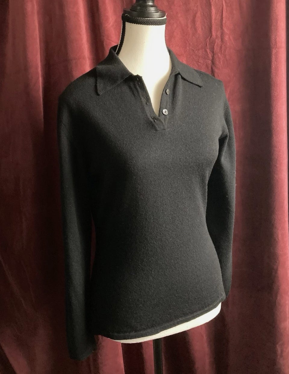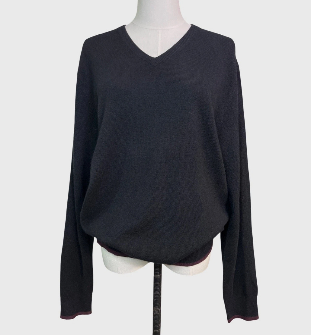 Barneys New York 100% cashmere black v-neck sweater (L), with burgundy trim.