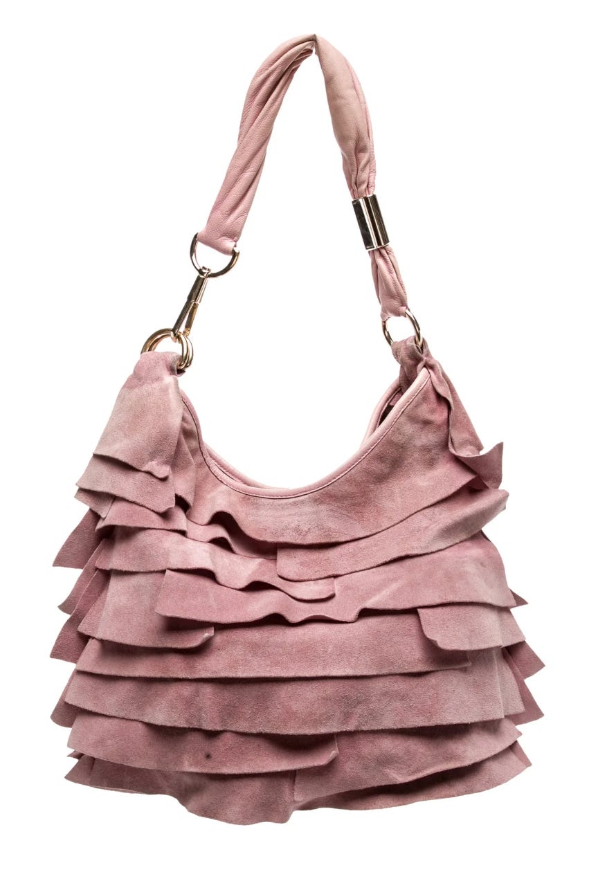 This vintage pale pink suede YSL Saint Tropez bag spent 20 minutes in my cart the other night, but I recently purchased two bags from The RealReal (and rolled the dice on their final sale policy), so I must abstain.