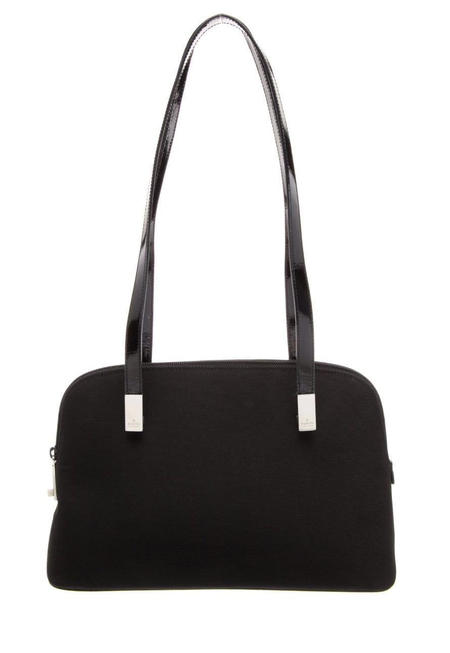 The combination of black canvas, patent leather straps, and silver hardware on this vintage Gucci shoulder bag really does it for me.