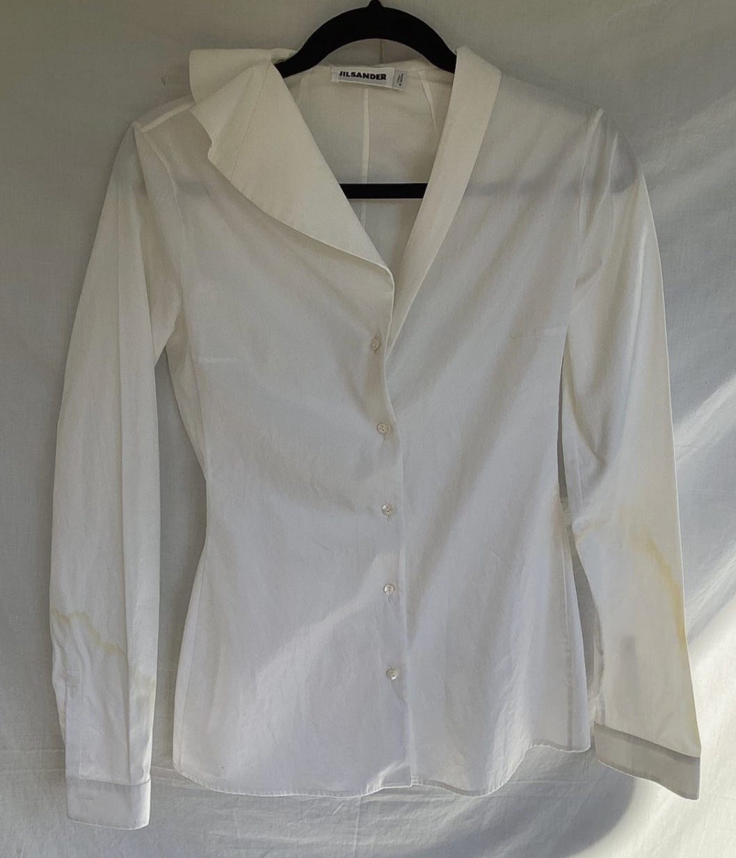 This vintage Jil Sander white cotton button-down with an asymmetrical collar is $50?