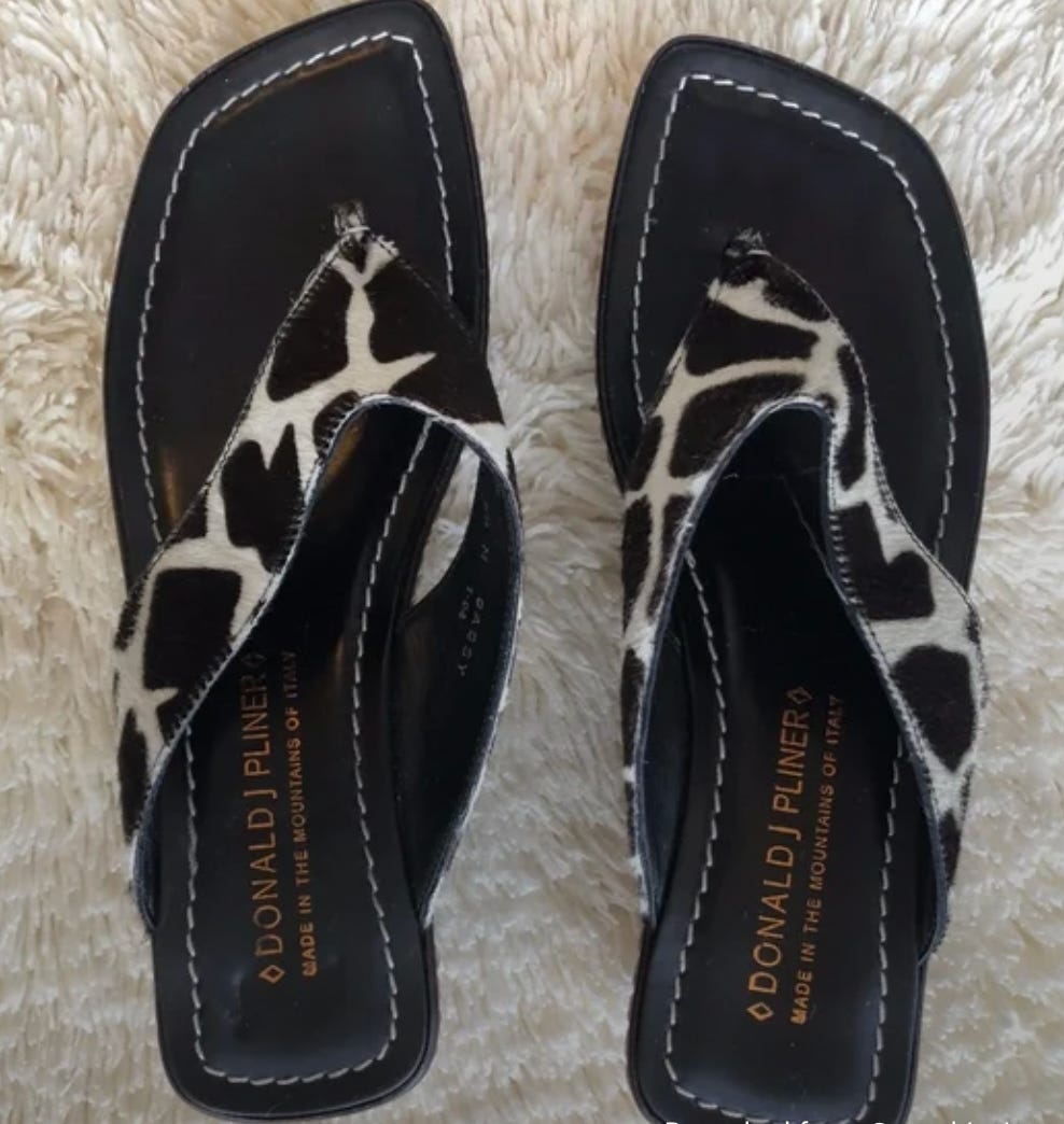 A low-stakes spring pick-me-up: vintage Donald J Pliner “sassy” giraffe thong wedges (US 8.5).