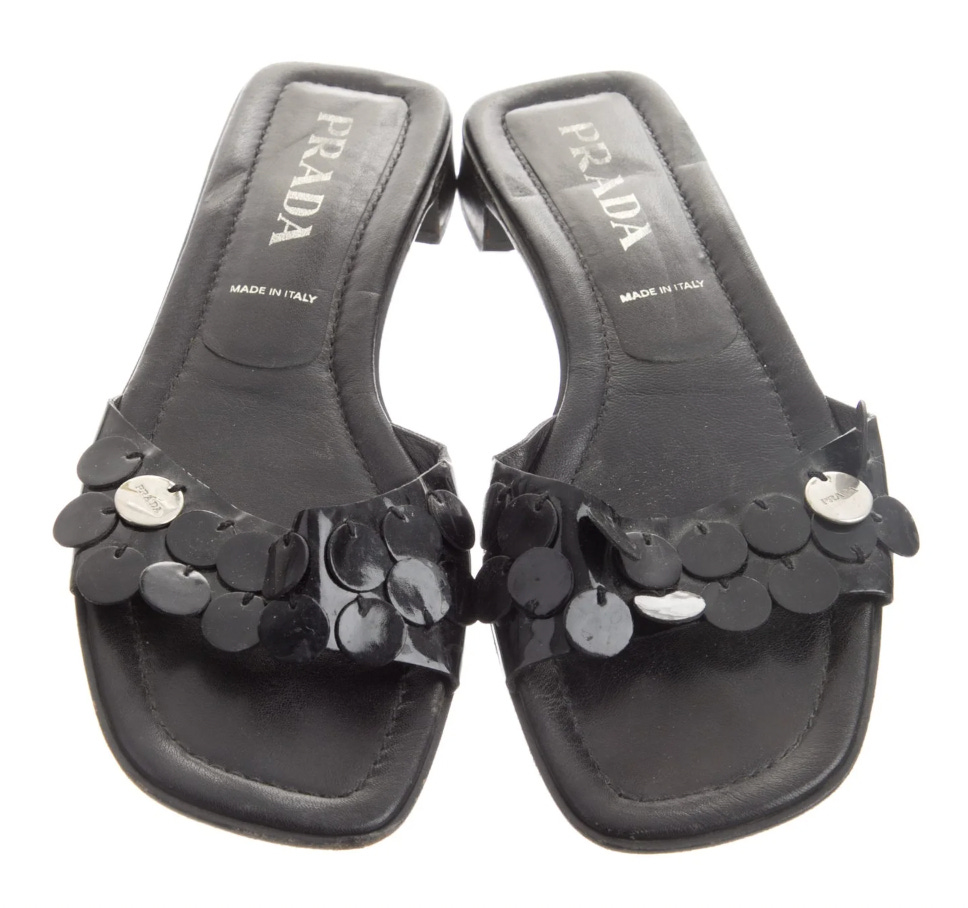 Black pailette-adorned Prada slides (US 9).
