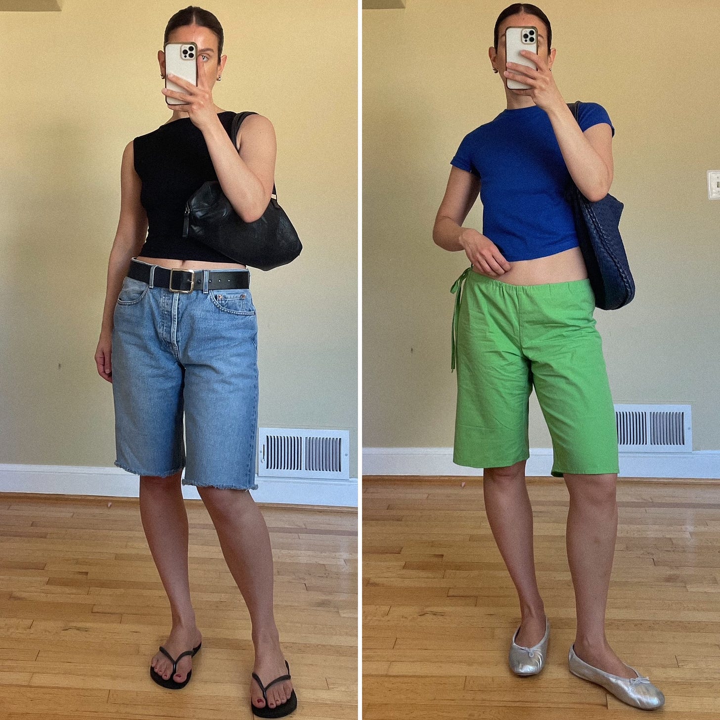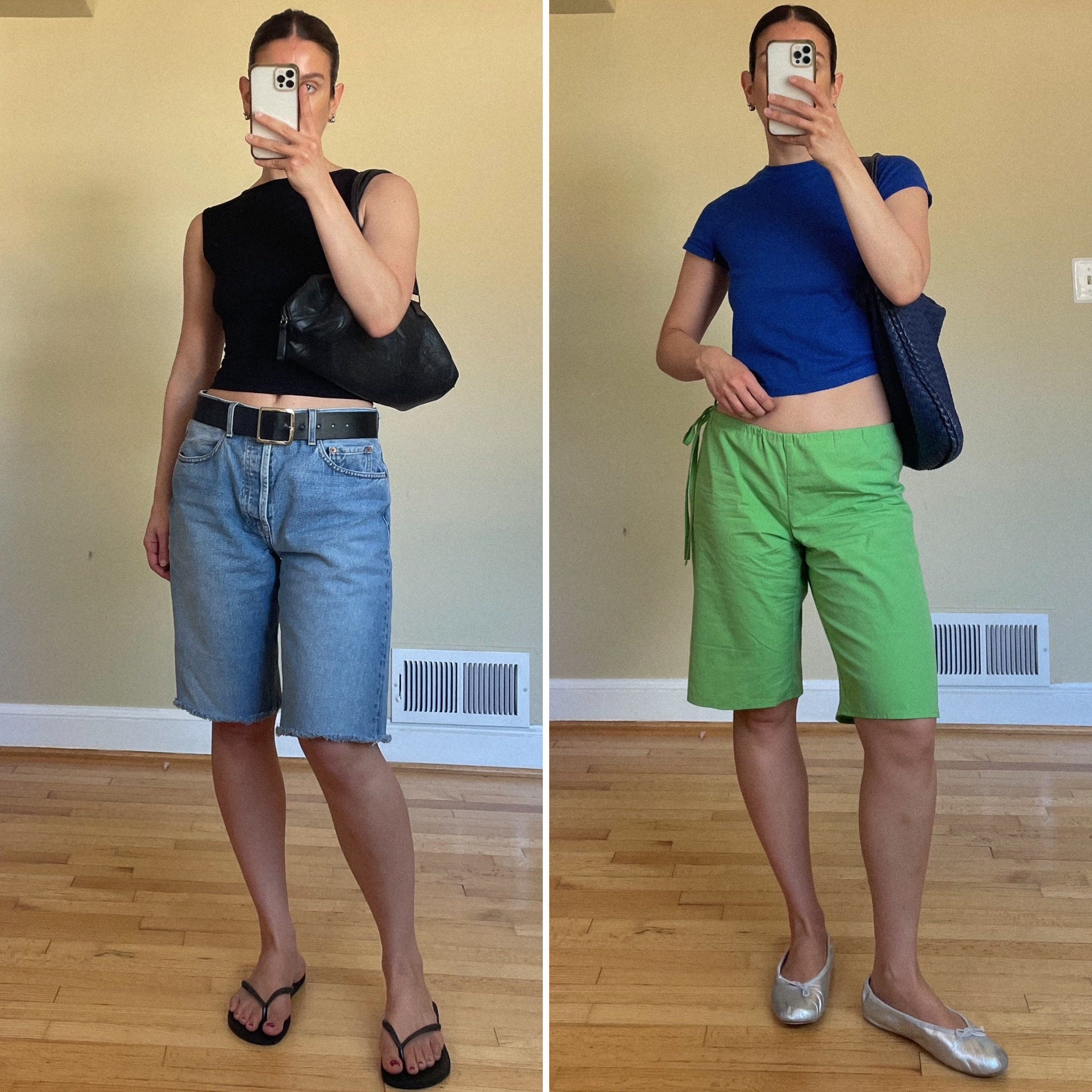 Inspired by the silhouette of my new Brooke Callahan tie shorts, I took a pair of tailor’s scissors to a pair of old FEEL jeans. The pair in question was my first postpartum denim purchase, now well-worn and a few sizes too big—I’ve worn the shorts everywhere from a kids’ birthday party to the farmer’s market and out to lunch with a friend. I’m considering altering my baggy white pair to this style next… stay tuned. Anyway, long shorts may have usurped capris as my new summer clothing fixation. Before we get into what I plan on wearing this month, a few knee-length shorts for your consideration: